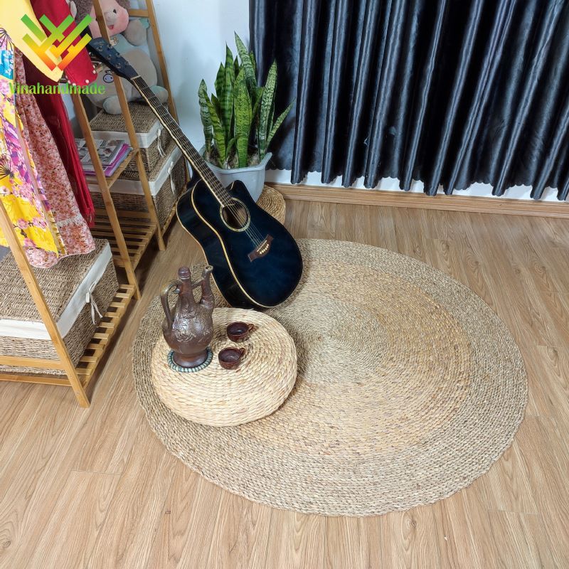 Với những bạn đang tìm mẫu thảm cói có kiểu đan liền mạch, dày dặn mà vẫn đậm chất nghệ thuật thì tham khảo qua mẫu thảm tròn cói mặt trời của Vinahandmade nhé. Đây là mẫu thảm cói có thể thích hợp trang trí cho phòng khách, phòng ngủ hay ngay cả phòng bếp của gia đình.